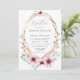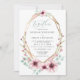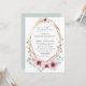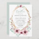 Wedding Invitation | Terrarium style frame with spring flowers in pink and light sage green eucalyptus leaves surrounding the frame. A combination of script calligraphy combined with a minimalist, contemporary style text layout makes it a trending style wedding suite. Design created for TheBarefootBride™ by © WhimsicalArtwork™. This is part of a wedding stationery suite collection with matching wedding accessories also baby shower and other occasion stationery. Feel free to contact us if you need assistance.