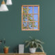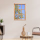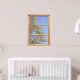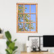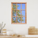 Spring is in the air! The season is heralded by the fresh green leaves that appear on the trees. Admire this view at any time of the year with a fake window effect poster that includes a photographed wooden window frame and the view beyond. Outside it's a beautiful day with a gentle blue sky and new leaves on the branches.
