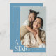 Modern New Year's photo template card featuring a text that says "a fresh start" with a curved frame picture. You can add another picture and a message on the back of the card. Denim blue color.