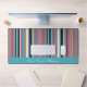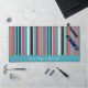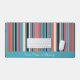 Stripes in fresh summer colours including shades of cranberry pink, cyan blue, almost black-blue, contrasting bright orange and white in irregular stripes with different widths set vertically. Personalise with your name or message in white font lettering set on a bright blue.