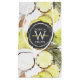 A lovely watercolor pattern featuring fresh tropical fruits with a black watercolor round badge with hand drawn white circles frame and a monogram.