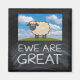 Fun sheep pun “Ewe Are Great” written on a chalkboard with picture of cartoon rendition of a sheep. Token gift item for those who adore sheep, like puns and want to send someone an encouraging message.