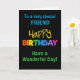 A colourful Birthday Card for a Friend, with brightly coloured lettering on a black background, the word 'happy' in yellow and the word 'birthday' in rainbow colours.