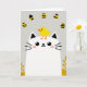 This card shows a minimalist scene on a soft grey background, with a rounded white cat-like creature resting across the lower half of the front. Its big dark eyes, tiny whiskers, and a faint pink blush on the cheeks give it a tender, friendly look, as if waiting for a close friend to lean in. Sitting on top of its head is a small yellow bird with dot eyes, an orange beak, and tiny orange feet, perched with easy trust like a sweet little date 🐇. Across the upper area, five egg-shaped decorations drift in a loose scatter, bringing a gentle spring mood 🌷. Each egg is bright yellow with black stripes and zigzag accents, standing out sharply against the muted background. Near the bottom corners, small sprays of yellow leaves peek inward to frame the pair without crowding them. A short greeting in black text sits near the top center, floating above the eggs.