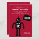 This friendly robot is saying "Hello". He's a stunning standout against the berry red background with the tiniest stripes. Perfect for a child's celebration.