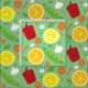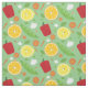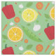 Fabric with a pattern of cute, smiling, fruit and vegetable characters on a green background. Select your fabric type and how many yards you need, add them to your cart, then enjoy your sewing or crafting products.