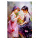 An AI-generated painting of two friends admiring flowers in a garden. It would be beautiful nursery decor.