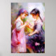 An AI-generated painting of two friends admiring flowers in a garden. It would be beautiful nursery decor.