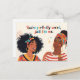 Celebrate beautiful friendship with this vibrant illustration featuring two radiant Black women laughing together. One wears colorful flowers in her natural curly hair, and the other sports a stunning, bright head wrap and jewelry. The playful quote, "You're perfectly weird, just like me," highlights the joy of shared quirks and authentic bonds.