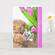 Teddy bear with tulip bouquet and polka dot border and lace for Friend's Birthday.