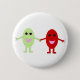 A round white button featuring a cute cartoon of a smiling red grape holding hands with a smiling green grape, both grapes have shiny black eyes and pink mouths.