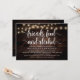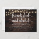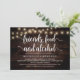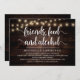 Modern Calligraphy Bridal shower invitation card (Friends, Food and Alcohol), in rustic dark wood string lights design themed. Invite the guests with this perfect Invitation Card. Add your bridal shower details in matching wording.
