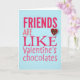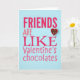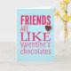 This cute friend greeting card features a powder-blue background that feels calm and welcoming. Across the center, the message reads, “FRIENDS ARE LIKE Valentine’s chocolates,” with “FRIENDS” and “LIKE” in large fuchsia block-style letters that stand out right away. The words “ARE,” “Valentine’s,” and “chocolates” are in softer, rounded lettering in light pink, giving the line a gentle, friendly look. A small red heart replaces the “i” in “Valentine’s,” adding a sweet little touch of love ❤️. In the upper right corner, there’s a red heart-shaped dish holding a few dark chocolates with a shiny finish, each one a slightly different shape 🍫. The simple layout and warm colors make it feel like a thoughtful note for a friend or someone you care about 💌.