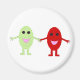 A magnet featuring a cartoon of a smiling red grape holding hands with a smiling green grape, both grapes have shiny black eyes and pink mouths.