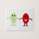 This awesome puzzle features a cute cartoon of a smiling red grape holding hands with a smiling green grape, both grapes have shiny black eyes and pink mouths.