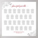 This beautiful wedding seating chart features dark gray and red text on a white background with seating assignments for 260 guests - 26 tables at 10 seats per table. It features a simple yet stylish and elegant design with ornate decorative faux foil silver filigree in the corners. The title is written in fancy script calligraphy and reads: Please find your table.