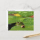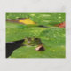 This postcard features a green frog peering out at the photographer from under his lily pads. It has just stopped raining. Sun is reflected on the water droplets. The size of a few fallen leaves demonstrates just how small this little guy is.