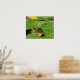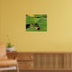 This poster features a green frog peering out at the photographer from under his lily pads. It has just stopped raining. Sun is reflected on the water droplets. The size of a few fallen leaves demonstrates just how small this little guy is.