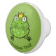 Green frog cartoon with golden crown. Prince frog. Custom background colour. Custom text.