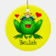 Cute green cartoon frog princess and prince with red hearts, cheerful yellow ornament, bringing you lots of love and hoppiness! The frogs' names are Beulah and Twitchy, but you can personalise this ornament with your own names or short text. This charming fairy tale royal couple wears golden crowns with red gemstones. The handsome Frog Prince has googly blue eyes and a wonky winning smile; the beautiful princess has sultry blue eyes, a beauty spot, long eyelashes and a somewhat sassy smile! Great gift for couples.