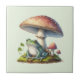 Ceramic tile with a cool illustration. Featuring a green frog sitting on a mound of grass. A big red mushroom sheltering him from the elements. A couple of little toadstools nearby.