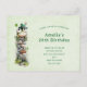 Birthday invitation postcard with a cute St. Patrick's Day image. A green frog with big cartoon eyes sitting on a stone wall. Wearing a green top hat with a shamrock and a little friend sitting on top of his hat.