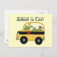 A frog bus driver drives the frog children to school in a yellow school bus and kid style text reads "School is Cool" on school T-shirts, mugs, magnets, cards, stickers, school tote bags, keychains, and more.
