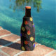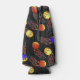 Frolf - Flaming Disc Golf bottle cooler. A cooler with background of chains with flying flaming discs in red, blue and yellow colours. Great gift for someone that is a Frolf fan.