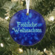 A swarm of blue fractal snowflakes. German text reading "Froliche Weihnachten" appears in glowing blue and white.