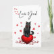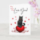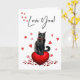 This delightful Valentine’s Day card features an adorable black cat standing on a large red heart, surrounded by hearts, with paw prints playfully walking off the page from the word "Love" on the front. The charming design and sweet, cat-inspired message inside—“Purring with happiness just thinking about you. So lucky to have you around today and every day. Happy Valentine’s Day to my very special human!”—adds a personal and loving touch. Perfect for cat lovers or anyone who would appreciate a cute and heartfelt greeting from their furry feline friend!