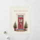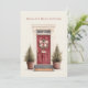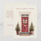 Beautiful and elegant holiday card with a lovely red front door with pine trees and a holiday wreath with a simple and quaint gingham bow.