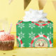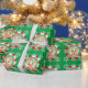 This festive custom wrapping paper features an outer frame with swirled a red and white peppermint candy cane design. The special phrase "Official Seal of the North Pole" is printed at the top, over a green circle. A custom name is printed at the top which you can personalise to include your own child's name or recipient. "From Santa" is printed in the bottom portion with the letters in the name "Santa" printed in a Christmas style font over a faux gold foil background. Expedited Parcel is printed below. Rudolph the reindeer antlers and red nose are printed in the back. The background is a vibrant green colour.
