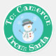 This custom sticker label features a festive Christmas theme that is perfect for labelling your gifts. A cute little snowman is pictured in the centre, standing beneath falling snow. A sample name is printed across the top, over a green banner. You can personalise the sticker to include your own custom name or other text. "From Santa" is printed across the bottom in the same whimsical font.