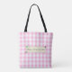 This all over print tote bag features the faux-patchwork message centred on a pink gingham background. The back side of the tote bag has the same pink gingham background and includes a coordinating faux-stitched "label" which provides a place to personalise with your name, your friend's name, or if you are a quilt shop owner, your quilt shop's name!