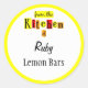 "From the Kitchen of" retro custom label art with scripty and cute kitschy letters against colour blocks of red, orange and yellow. Room for your name in script letters and a second line of text in cute blocky letters. Click Customise It to change fonts, edge colours and more, even save your design for later.