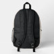 Front and back view of a backpack with a playful red and green parrot pattern on a beige background. The back is solid black with padded straps.