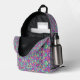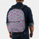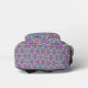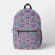 Front and back view of a colorful backpack with a vibrant geometric pattern in pink, purple, and green tones. Black straps and mesh side pockets.