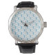 Front and back views of a wristwatch. The face has a blue floral pattern with black hands, and a black leather strap. The back has engraved details.