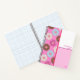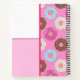 The artist's pattern design of frosted doughnuts is on the side of the notebook, front and back. On the other is a white and pink square with a pink line in the middle. And the texts can be personalised by the customer.