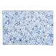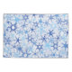 A wintry design of blue and white snowflakes on a frosty white textured background.
