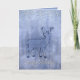 Elegant blue foil looking holiday greeting card with the embossed looking silhouette of a stag deer and blue and silver glitter, raining down from the top. Silver tone graphic text reads Happy Holidays. Personalize the custom text inside the card to suit your holiday needs.