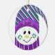 A cute little snowman in a striped purple, white and green toque and a green scarf. Sweet cheeks and a orange button nose.