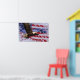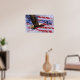 A beautifully patriotic image of an American Bald Eagle bird soaring over snow covered mountains, on a waving American Flag bordered with frozen snow and ice. The frozen flag photo was taken by the observant sharp-eyed photographer, Rob Boyer.