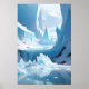 The image depicts a breathtaking frozen landscape, dominated by towering ice formations and a serene, reflective lake. The ice cliffs rise dramatically, their edges sculpted into jagged peaks and smooth curves, casting long shadows across the snow-covered ground. The lake's surface is a mirror, reflecting the sky and the surrounding ice, creating a sense of tranquillity and isolation.