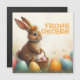 Ein niedlicher Osterhase mit einer Blumenkrone sitzt liebevoll inmitten bunter Ostereier. In seinen Pfoten hält er ein kleines Weidenkörbchen mit bemalten Eiern. Die Szene ist von zarten Frühlingsblumen und warmem Licht umgeben. Über dem Hasen leuchtet in fröhlichem Orange die Aufschrift „Frohe Ostern“ – ein herzlicher Gruß, der die Leichtigkeit und Freude des Frühlingsfestes einfängt.