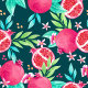 Seamless pattern with pomegranates, flowers and leaves on a dark background, watercolor style. The pomegranates are depicted in various states, some whole, some halved to reveal the seeds inside. The flowers are small and delicate, with pink petals and yellow centres. The leaves are green and blue, with a variety of shapes and sizes. The background is a dark colour, which makes the fruits and flowers stand out. The watercolor style gives the pattern a soft, organic feel.