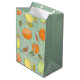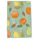 Fruit pattern with lemons, oranges, lime and grapefruit. Bright citrus fruits on a light green background with multicolored splashes of paint.