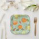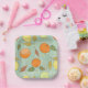 Fruit pattern with lemons, oranges, lime and grapefruit. Bright citrus fruits on a light green background with multicolored splashes of paint.