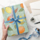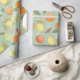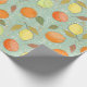 Fruit pattern with lemons, oranges, lime and grapefruit. Bright citrus fruits on a light green background with multicolored splashes of paint.