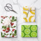 Wrapping paper in fruit patterns - botanical cherry print on a white background, golden yellow bananas on a white background, and lime slices on a deeper lime green background